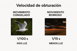 - Ejemplo: Para capturar aves en vuelo, utiliza 1/2000s. Para tomar fotos de estelas de luces en la noche, experimenta con 2 segundos y usa un trípode.