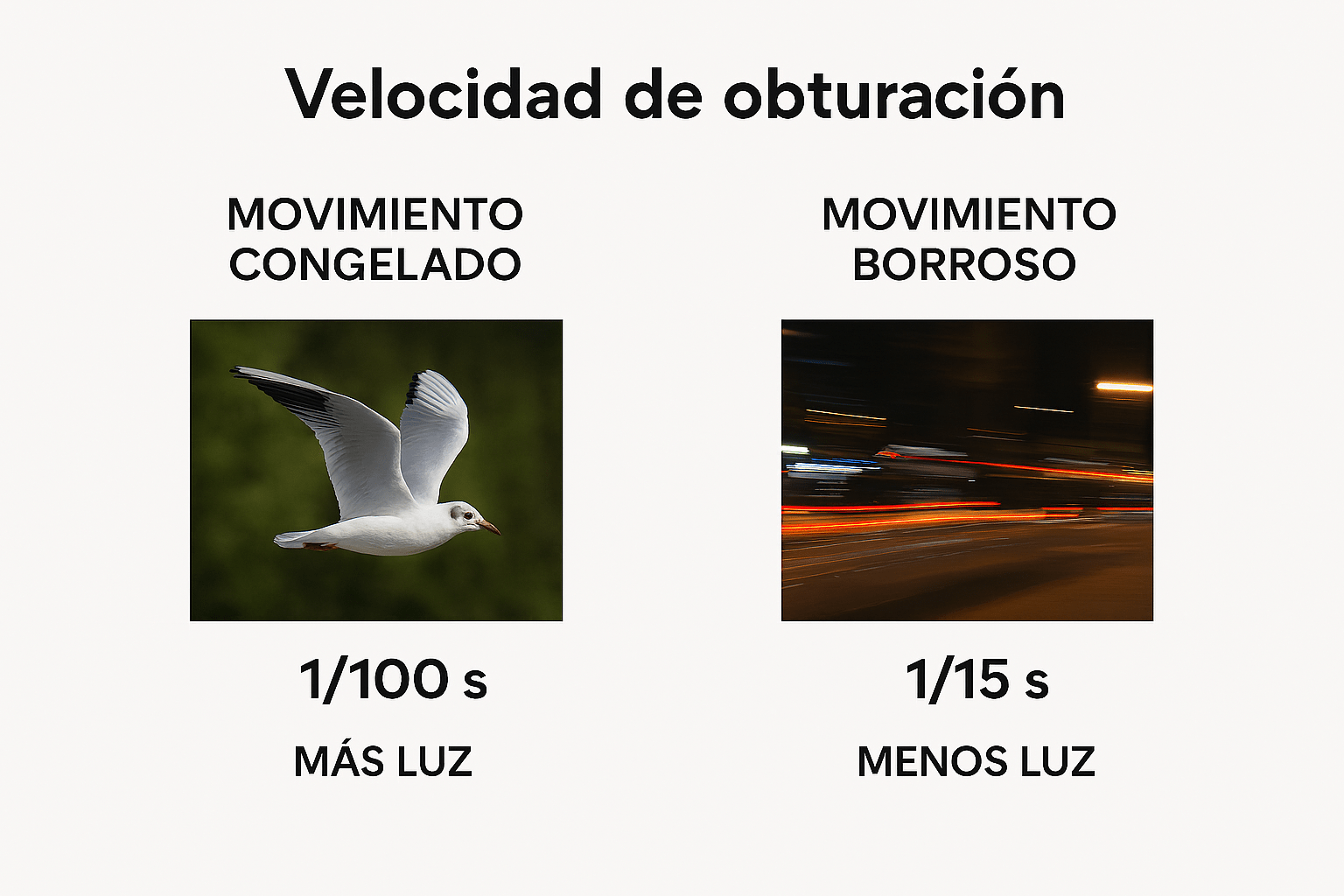 - Ejemplo: Para capturar aves en vuelo, utiliza 1/2000s. Para tomar fotos de estelas de luces en la noche, experimenta con 2 segundos y usa un trípode.